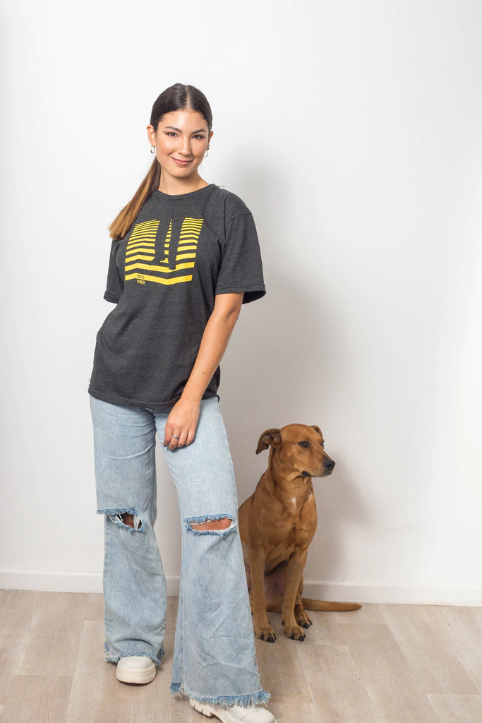 Disponible en gris oscuro con estampa amarilla.